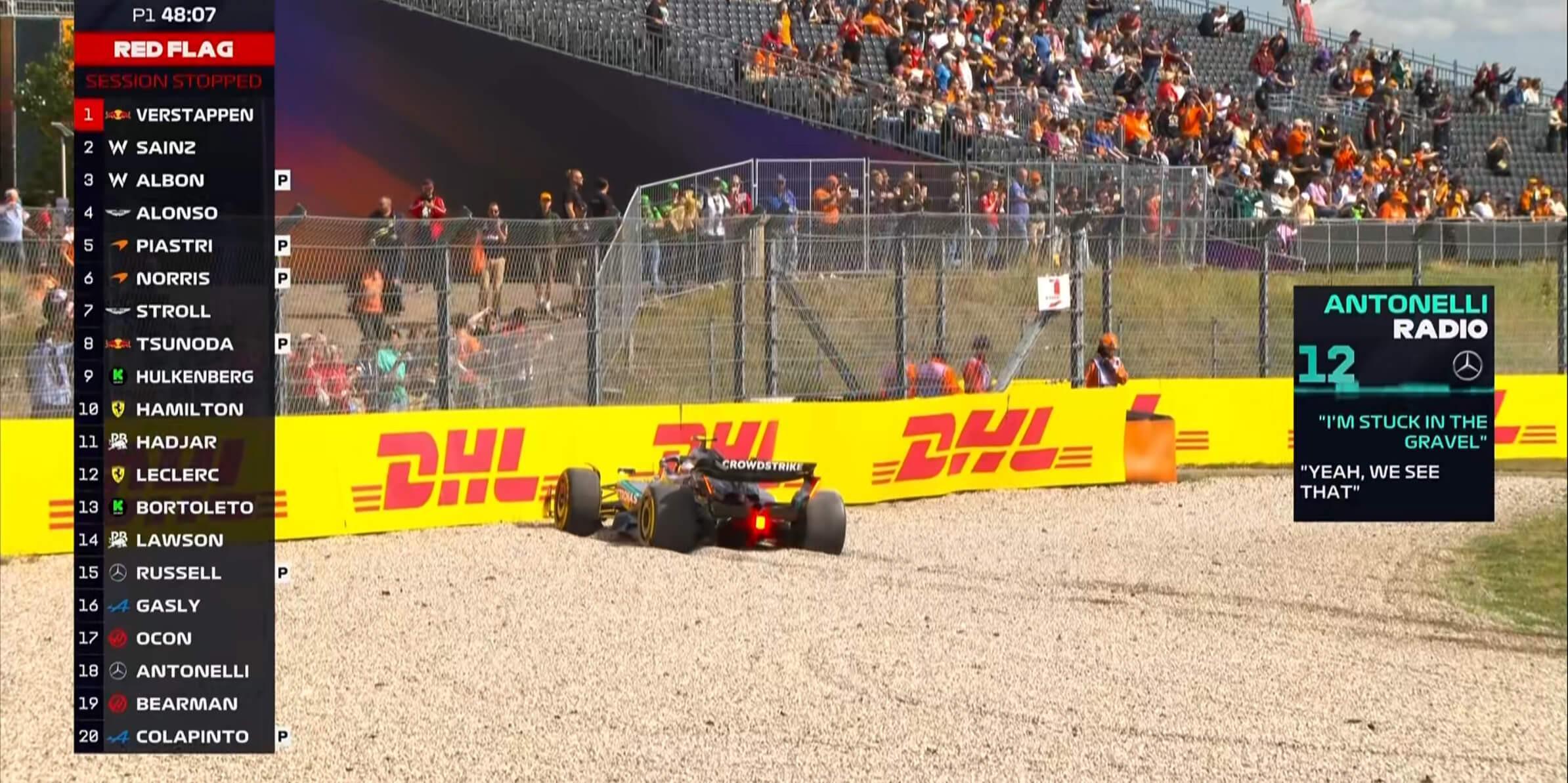 红旗!安东内利的赛车陷入砂石地,好在他及时刹车赛车未受损!