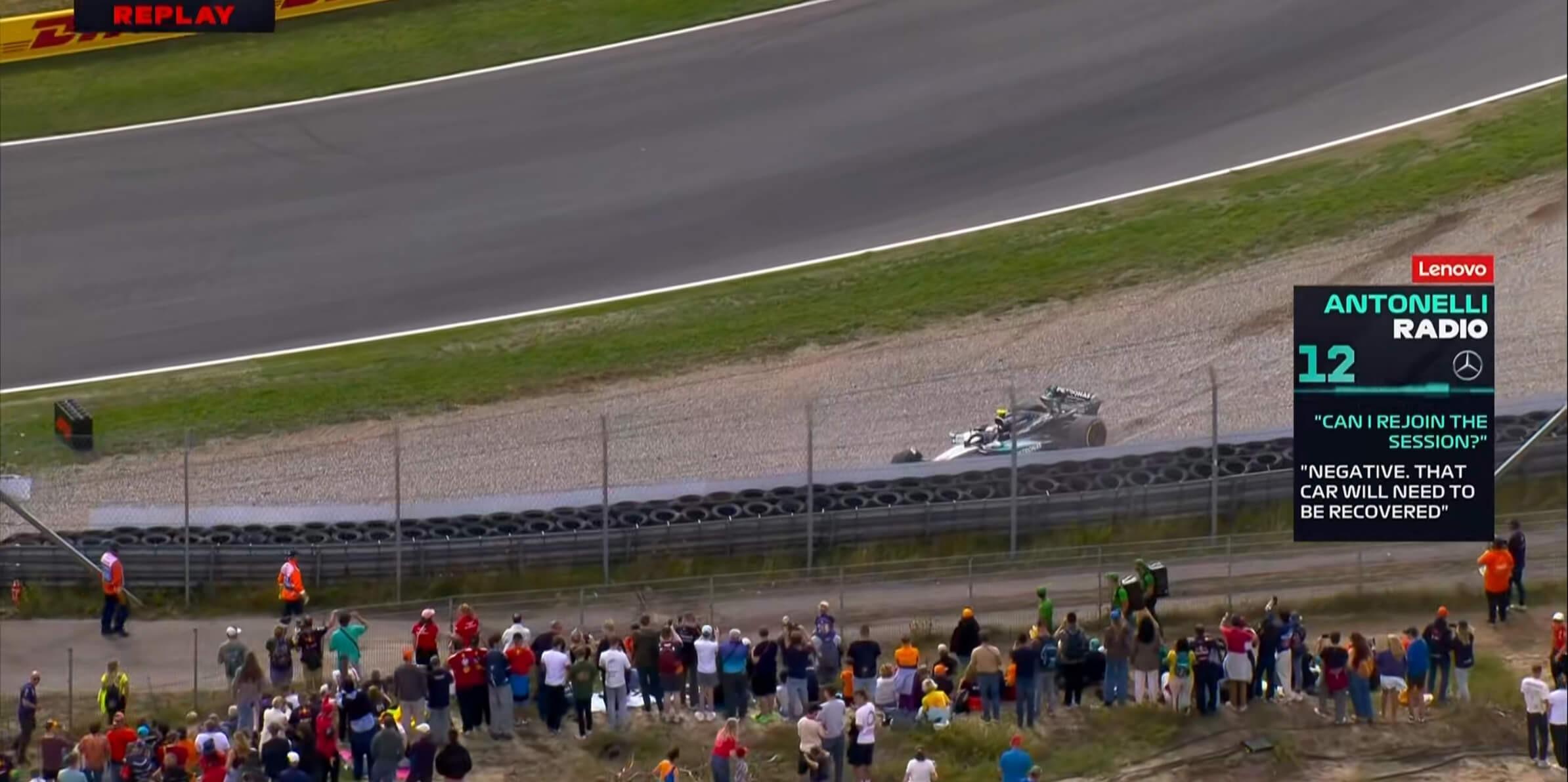 安东内利询问Bono是否可以重返赛道,但他的赛车已陷入缓冲区,需要吊车来进行清理,他的一练也随之结束;