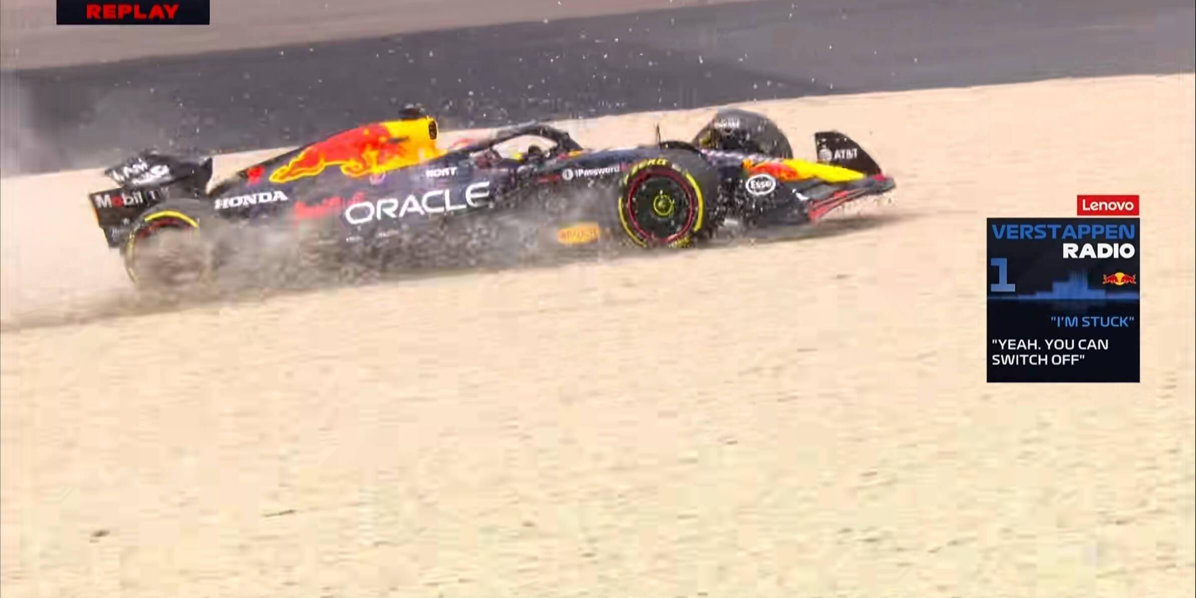 一练停表后,维斯塔潘在1号弯错过刹车点陷入砂石地,他也选择熄火后下车;